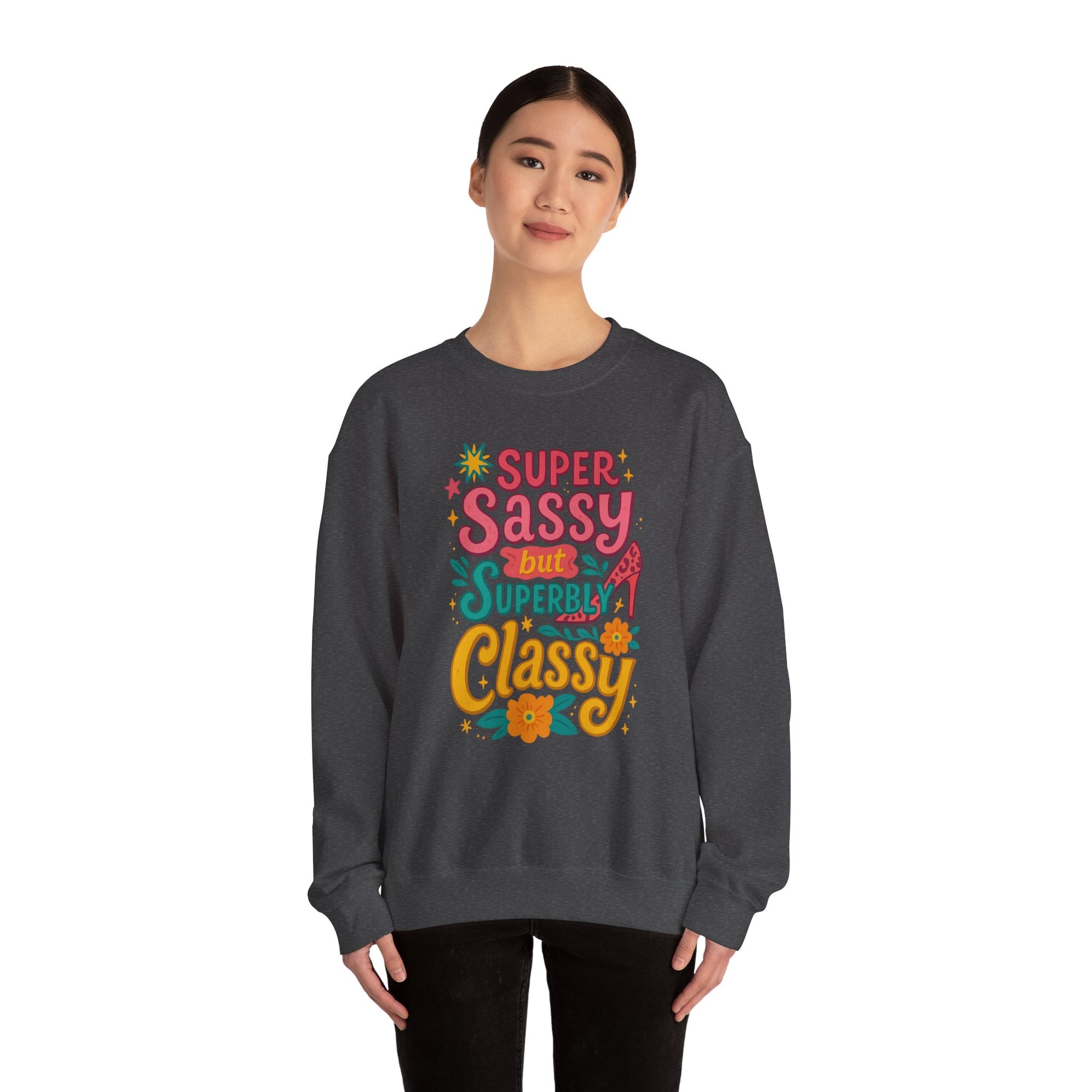 Stay cozy and stylish with this Unisex Heavy Blend™ Crewneck Sweatshirt, perfect for those who embrace their inner sass and class. The vibrant design makes a statement, adding a fun pop to your wardrobe while keeping you warm during the cold months. Whether you're lounging at home or out with friends, this sweatshirt is a versatile addition to your outfit. Ideal for casual gatherings, cozy movie nights, or as a standout gift for your sassy friends on occasions like birthdays, Galentine's Day, or just because! Its comfortable fit is perfect for adults looking to express their playful side without sacrificing comfort.